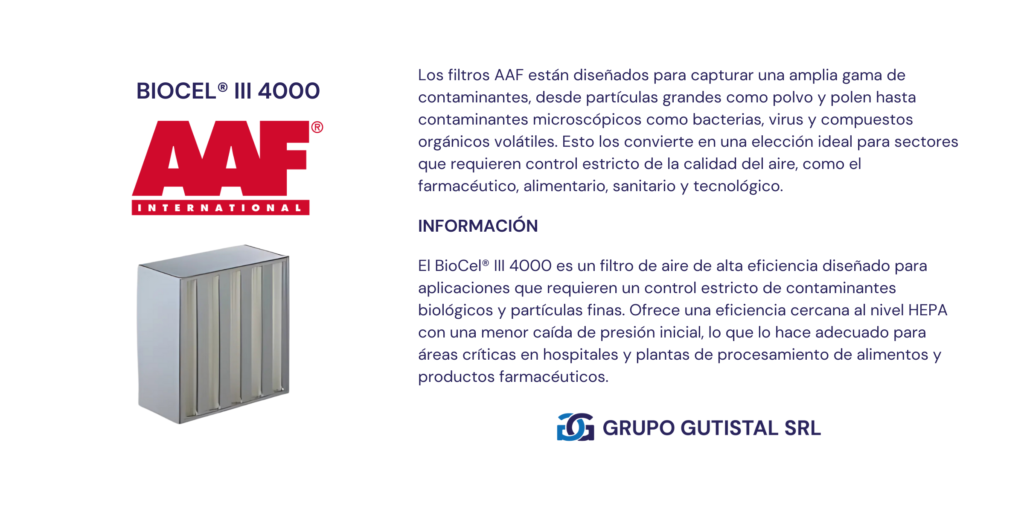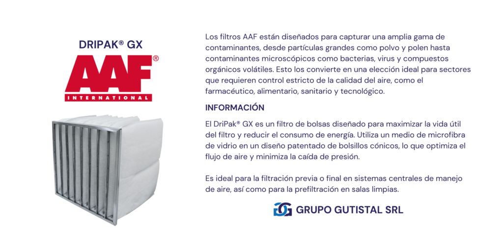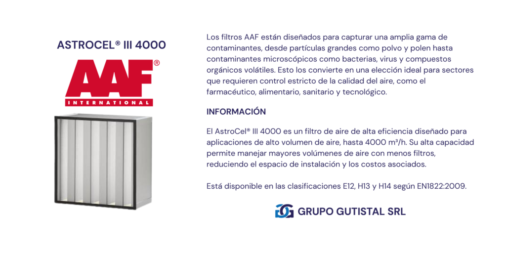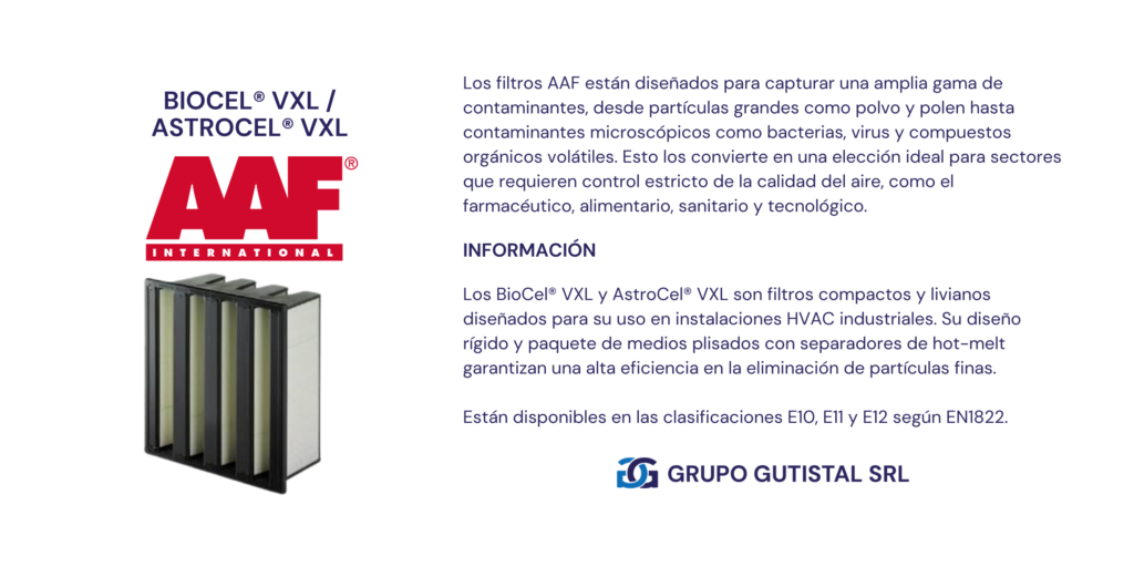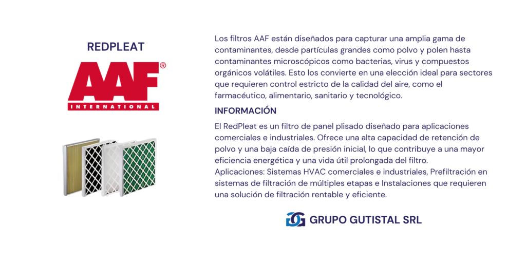 Los filtros de aire AAF (American Air Filter) están diseñados para garantizar la calidad del aire en una amplia gama de entornos, desde aplicaciones comerciales hasta procesos industriales críticos. Con más de un siglo de experiencia, AAF se ha convertido en un referente global en tecnología de filtración, ofreciendo soluciones personalizadas que combinan eficiencia, durabilidad y sostenibilidad.
