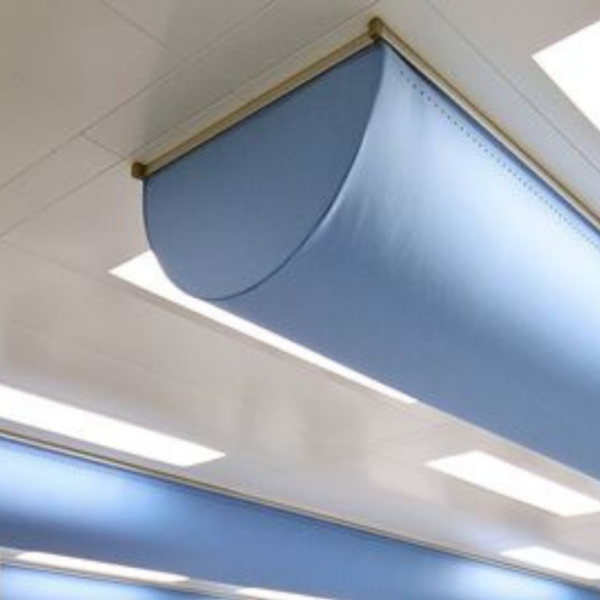 Ideal para espacios con altura de techo limitada, el ducto textil semicircular se instala directamente contra el techo mediante un sistema de perfiles de PVC, optimizando el espacio disponible. Esta configuración es común en aplicaciones de aire acondicionado de confort, donde se busca una solución estética y eficiente.